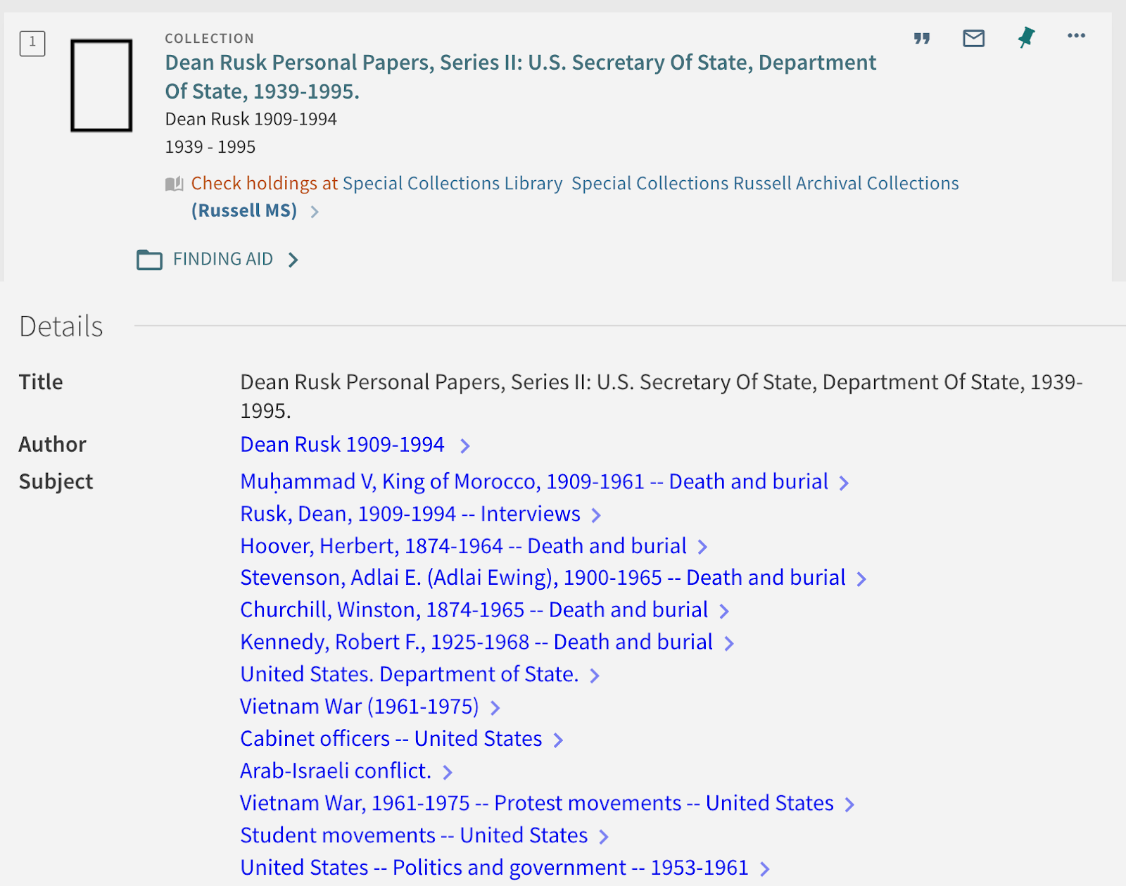 For example, these 1962 Department of Defense publications related to nuclear attack preparation were found among the vast collection of personal papers of a Georgia-born U.S. Secretary of State, but the finding aid entry doesn’t indicate such materials. One just has to sort through lots of boxes.