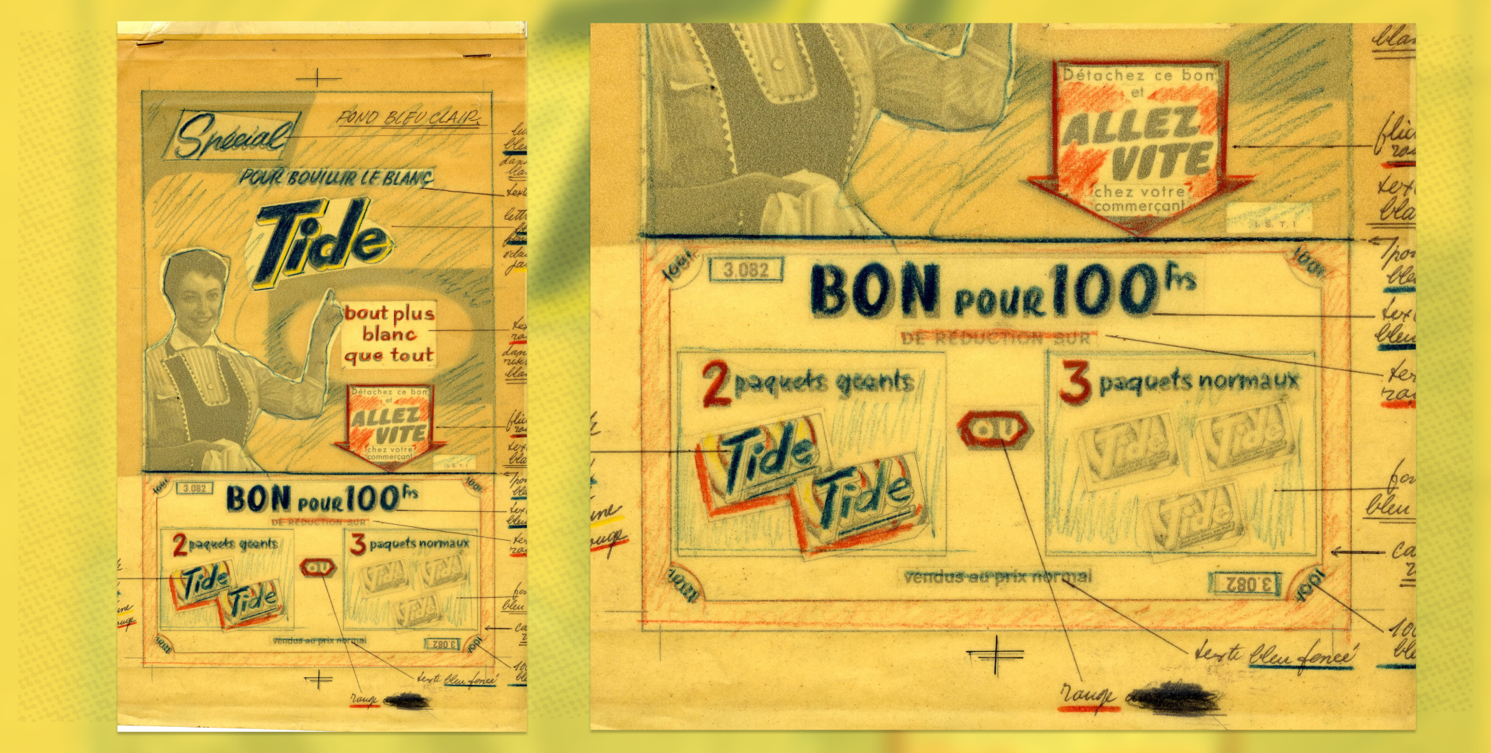 The washing powder advert in question came from an important, now defunct printing firm which had been established in Lyon in the late 19th century. The former proprietor of the firm, who had hung on faithfully to the firm’s archives for a couple of decades before gifting them to The Museum of Printing in 2012, couldn’t understand why we started jumping up and down with excitement when we discovered a box of layouts from the 1950s. His immediate reaction was that they were worthless and of no interest to anybody and that we should throw them in the bin. The fate reserved for the vast majority of the working documents which tell us so much about graphic processes in action.