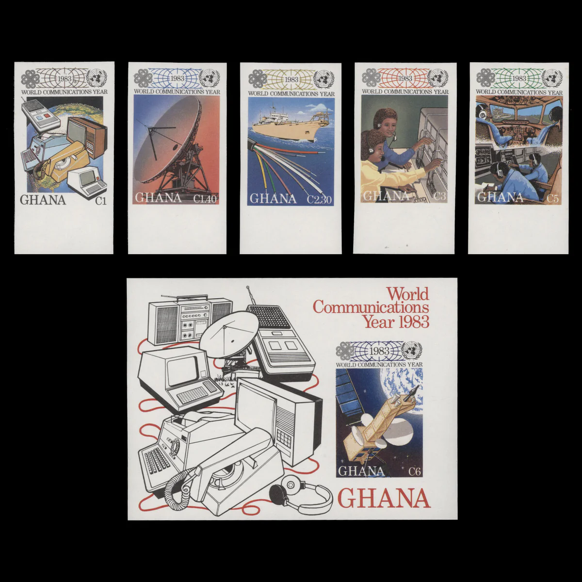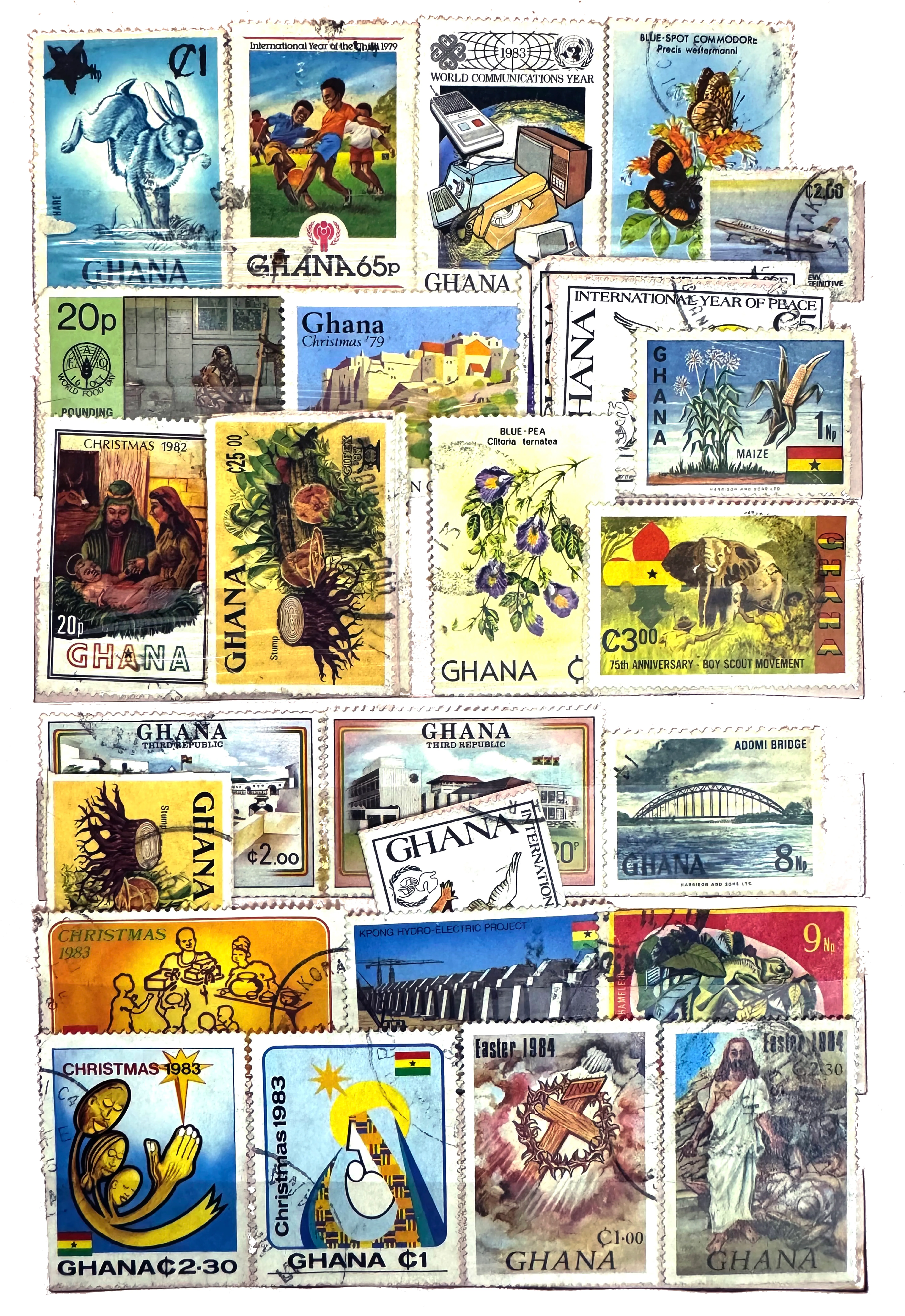 My grandfather’s friend was in Ghana from roughly 1978 to 1985. The third stamp in the first row is from 1983. The meta nature of this stamp for World Communications Day is funny to me. Here is my grandfather talking with his friend, via stamp, a communication technology that isn’t hinted at in the illustration on the stamp itself, and yet is the medium.