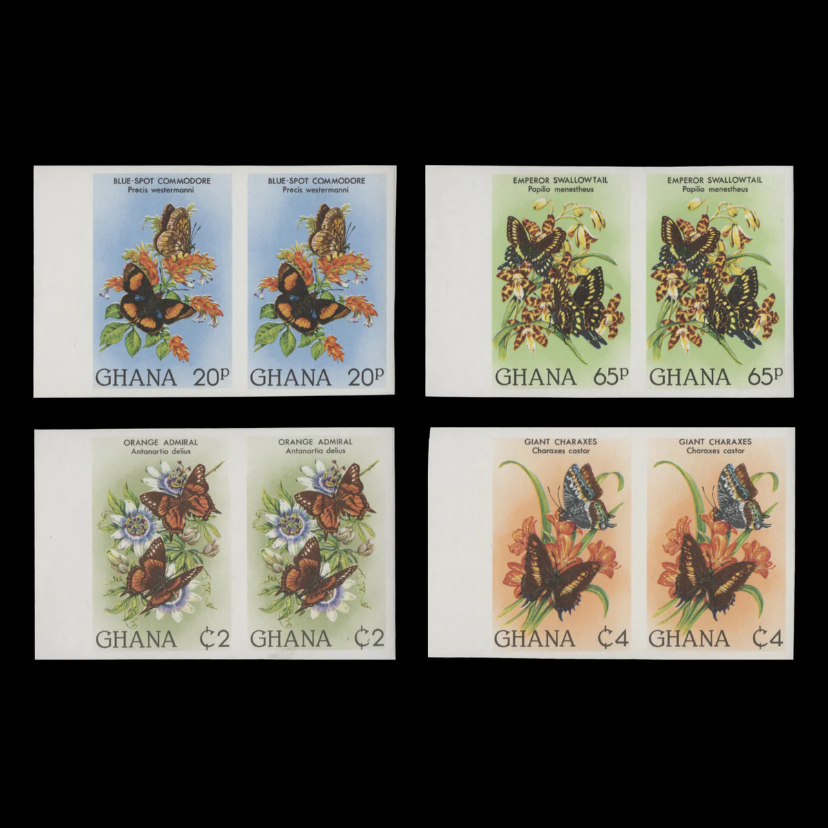 The currency on the stamps seems to jump around. Usually, on the top right or left corner, the currency is denoted with a p (20p, 65p), referring to pesewa. In later stamps, this shifted to Np indicating the introduction of the new pesewa (6Np, 10Np, and so on), an effort to reform the currency at a time of high inflation and deteriorating currency.