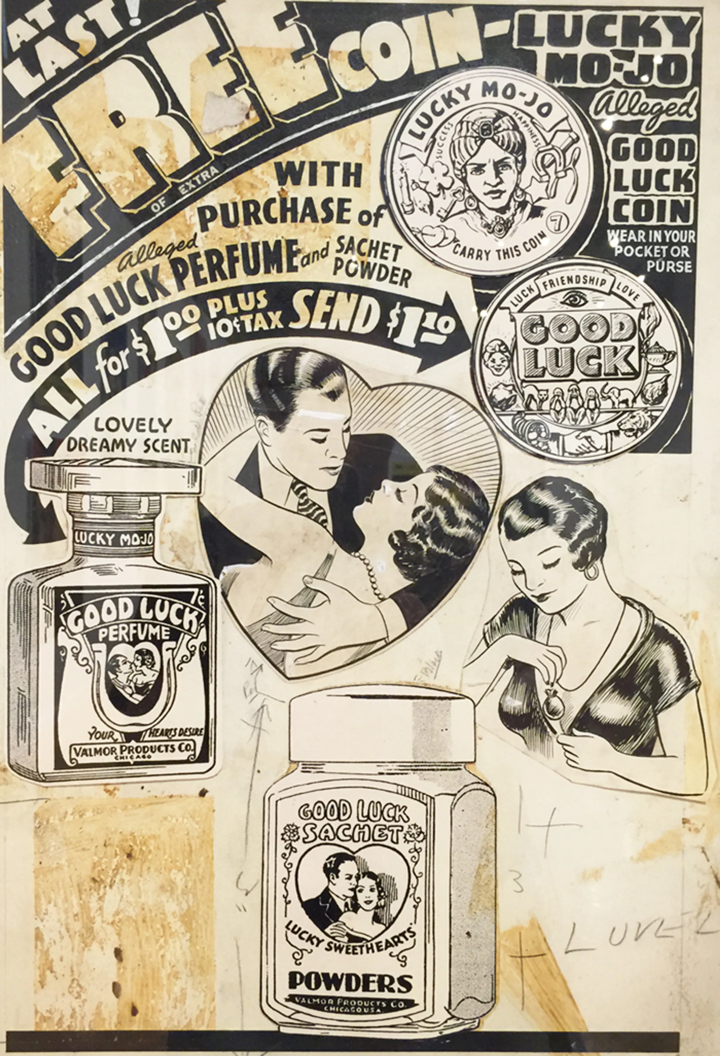 Original paste up for advertising, exhibiting good luck coins and perfume. Art by Charles Dawson.