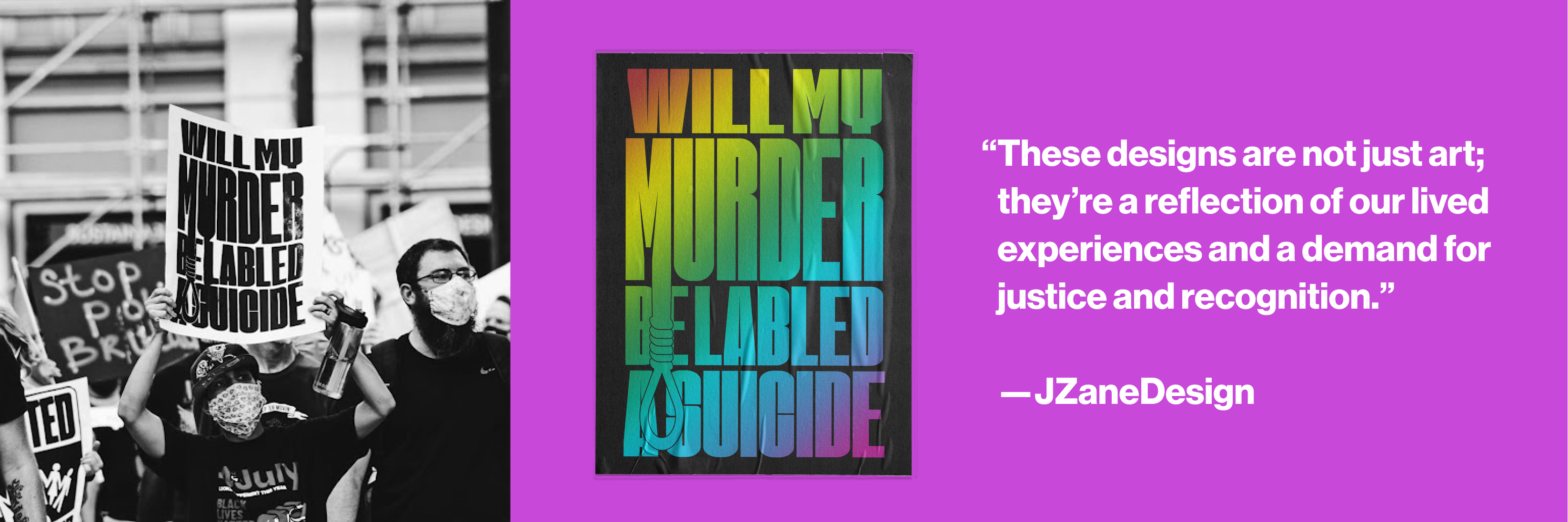 The ‘Will My Murder Be Labeled a Suicide’ poster was my way of confronting the horrifying pattern of Black and Brown deaths being mislabeled as suicides. The inclusion of the noose in the design connects these tragedies to the legacy of lynching during the Jim Crow era, evoking both historical pain and a call for accountability. These designs are not just art; they’re a reflection of our lived experiences and a demand for justice and recognition.”