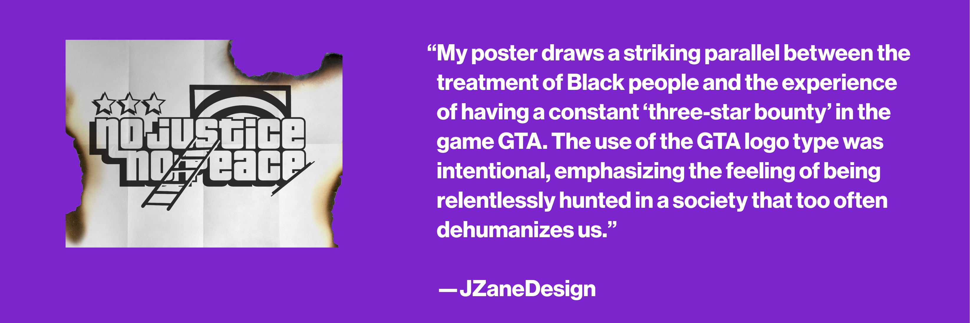 “As a designer and a person of color, my work on the ‘Print for Protest’ project was a deeply personal response to the systemic injustices faced by Black and Brown communities. My ‘No Justice No Peace’ poster draws a striking parallel between the treatment of Black people in America and the experience of having a constant ‘three-star bounty’ in the game GTA. The use of the GTA logo type was intentional, emphasizing the feeling of being relentlessly hunted in a society that too often dehumanizes us."