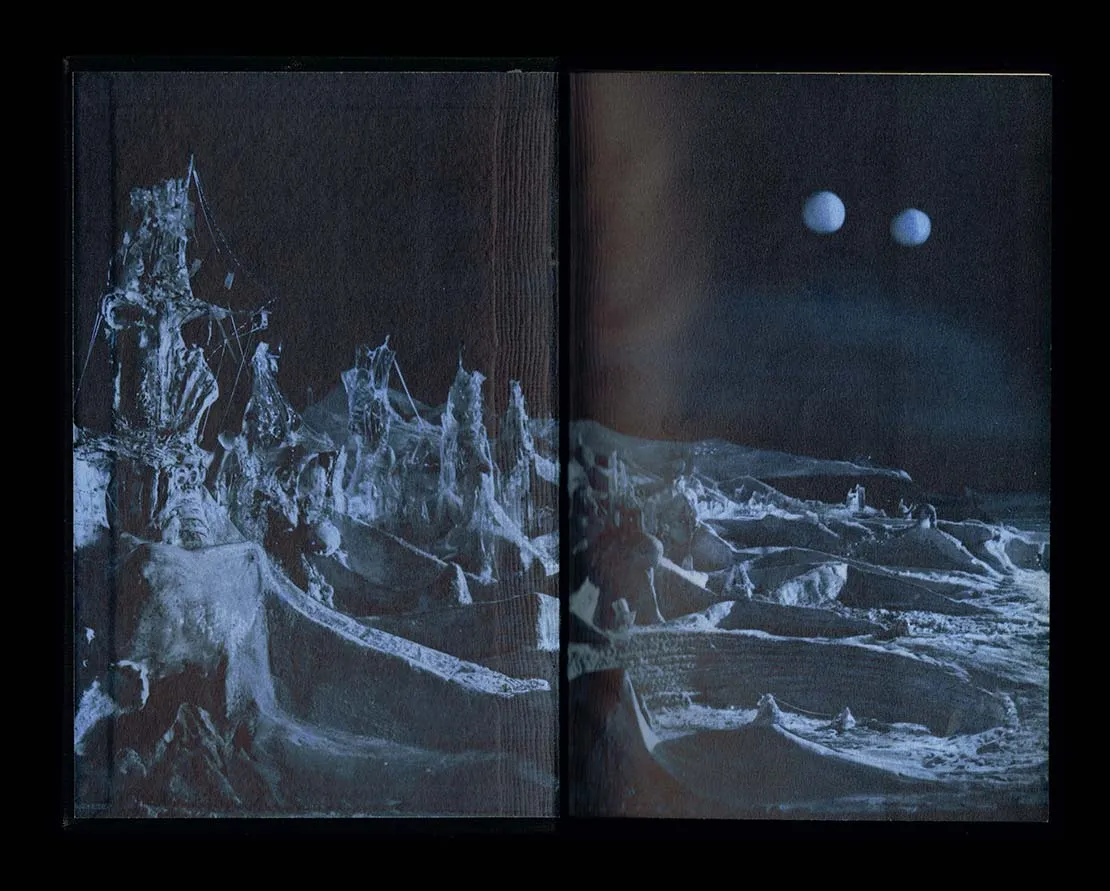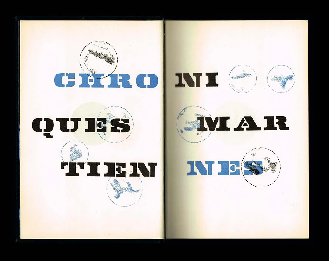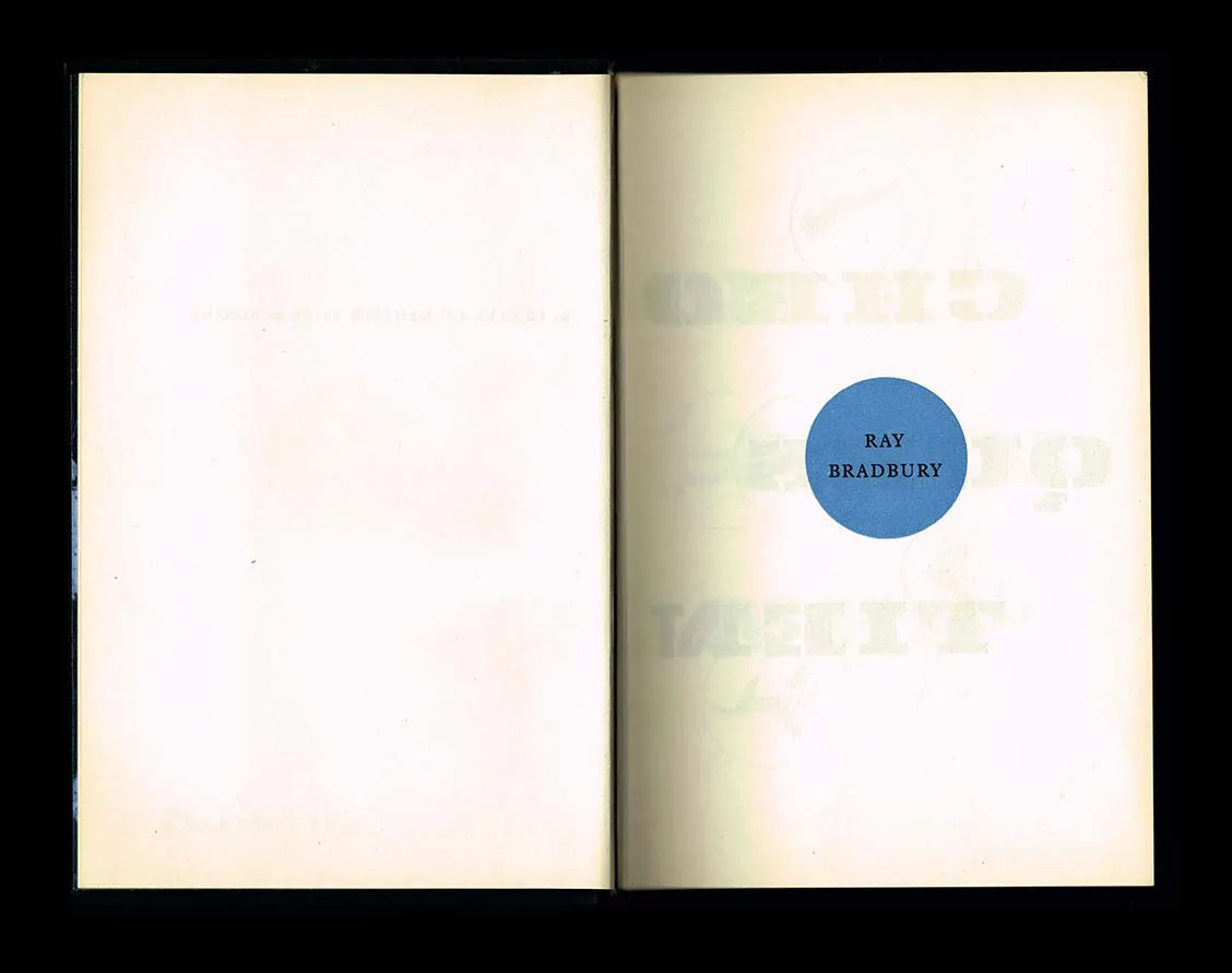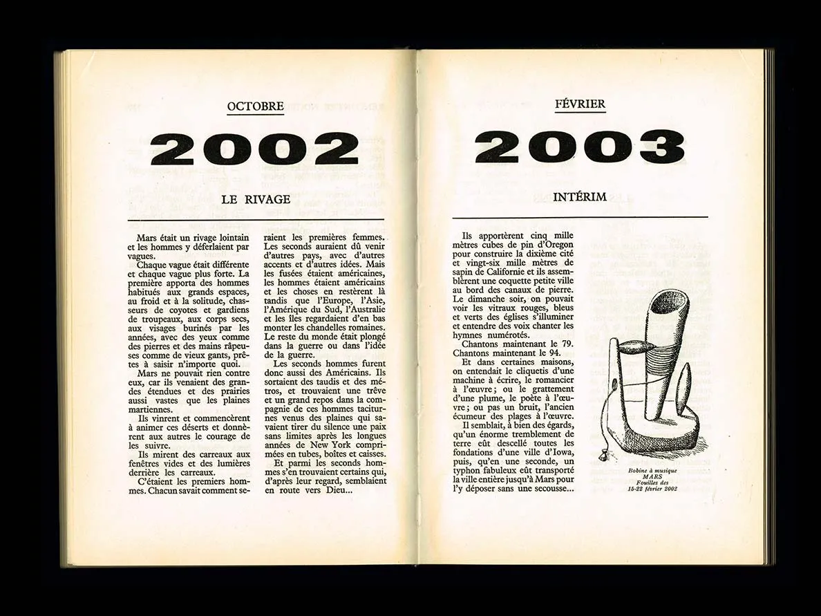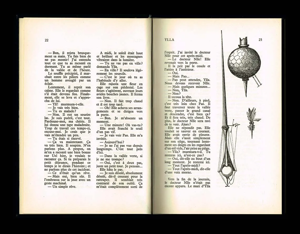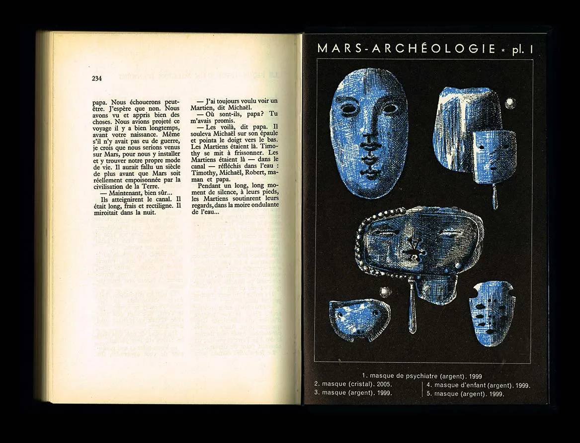 Another favourite from the collection is the famous book Chroniques Martiennes (The Martian Chronicles) by Ray Bradbury, published by the Club in 1955. In this book, the cloth-bound black hardcover is illustrated with a representation of the planet Mars in white and blue silkscreen, making a true impact over the dark black background. Inside the book, Fricker plays with its typography from the title page to the text block, where she decides to set the text in two columns with a big chapter title, helping us realise that this book is not composed of a single story but of different short stories written across time. The text is supported by illustrations of Jacques Noël, which help to visualise the storytelling better.