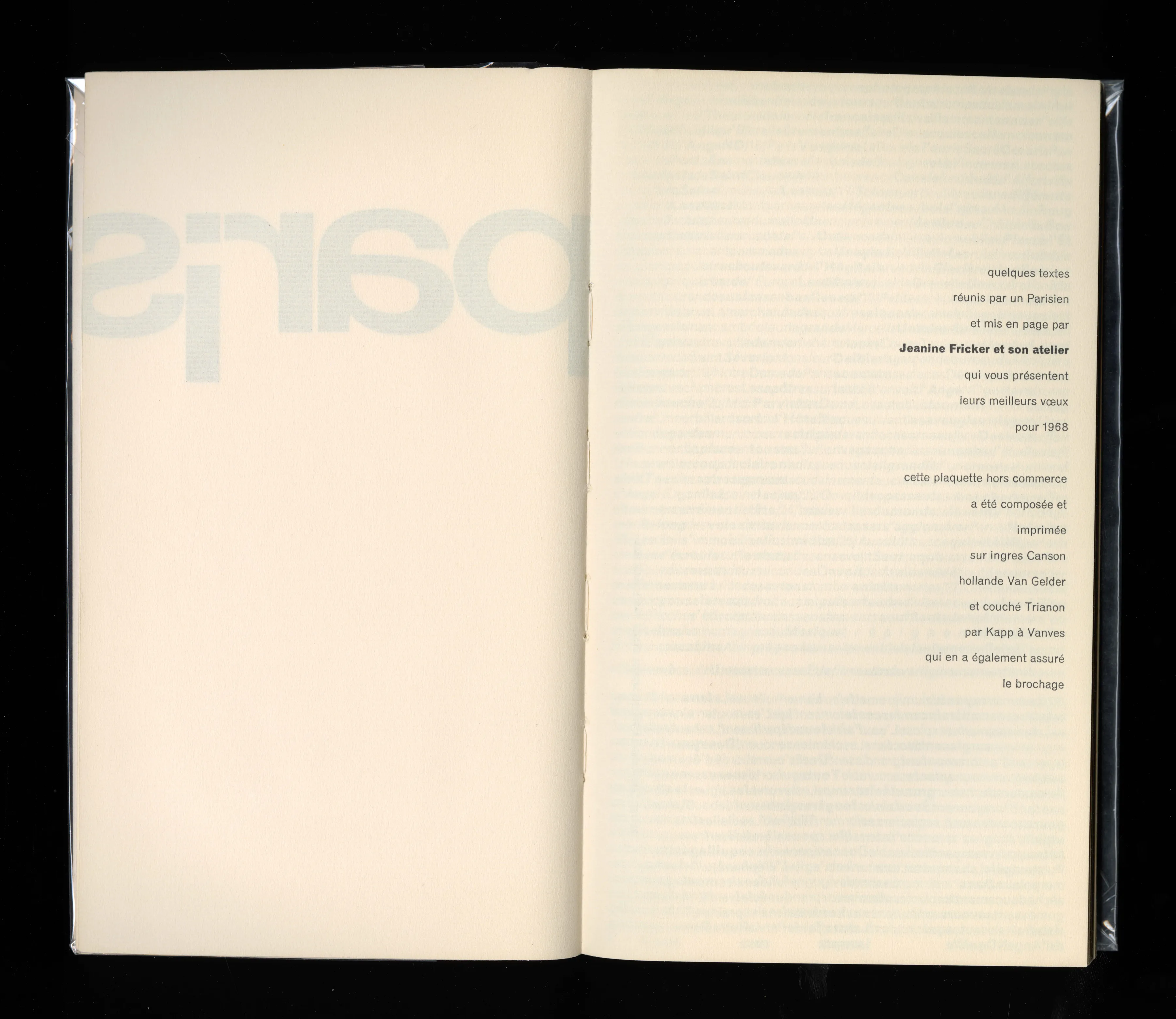 Some years ago, a dear friend gifted me a very precious book that he found in a second-hand bookstore in Paris. A book published by Fricker’s studio, to be given to clients and friends. The edition, simply called Paris, published in 1968, pays homage to the city that she loved so much, with poems from different authors portraying the city, accompanied by small illustrations. This book is one of the rare objects to which I had access, in which the studio is mentioned.