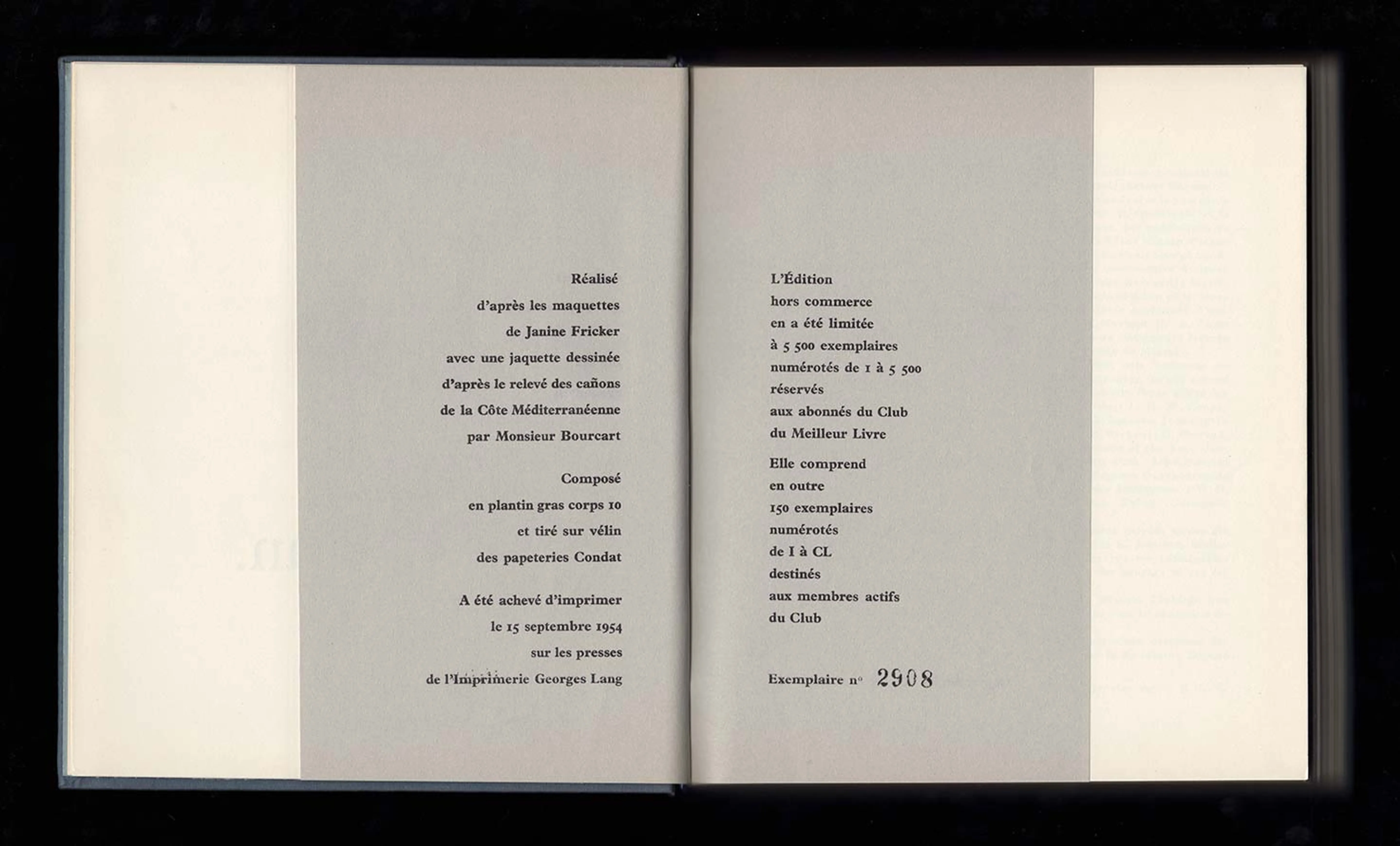 The first book she designed for the Club was the novel La Joie by Georges Bernanos, published in 1954. For the cover, she decided to go for a lettered title roughly based on a Garamond construction. Grey background, white letters, simple. The text inside is composed in Garamond with a straightforward layout, with the text being embraced at the beginning and at the end of the book by reproductions of handwritten notes that appear on a different paper.