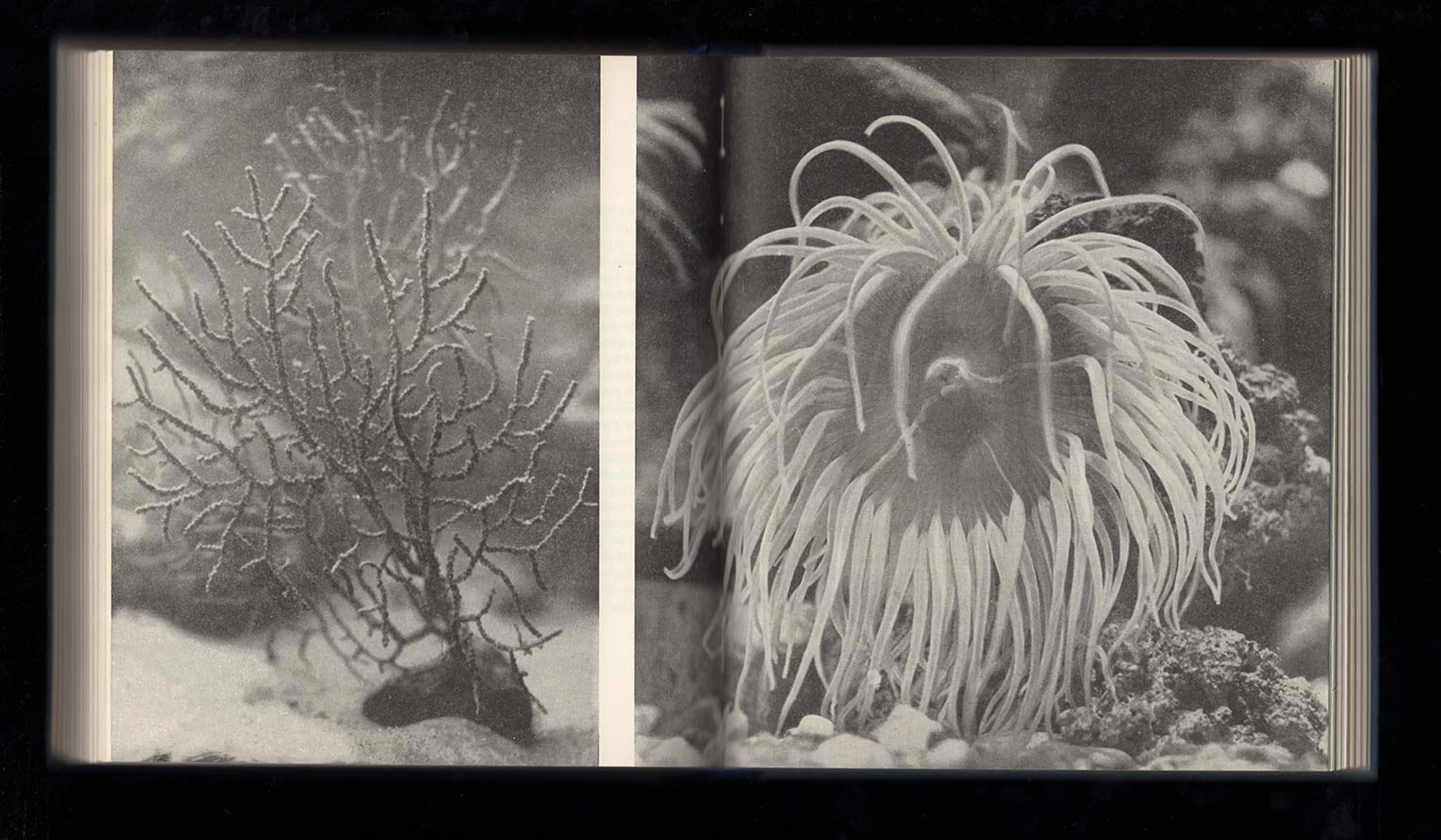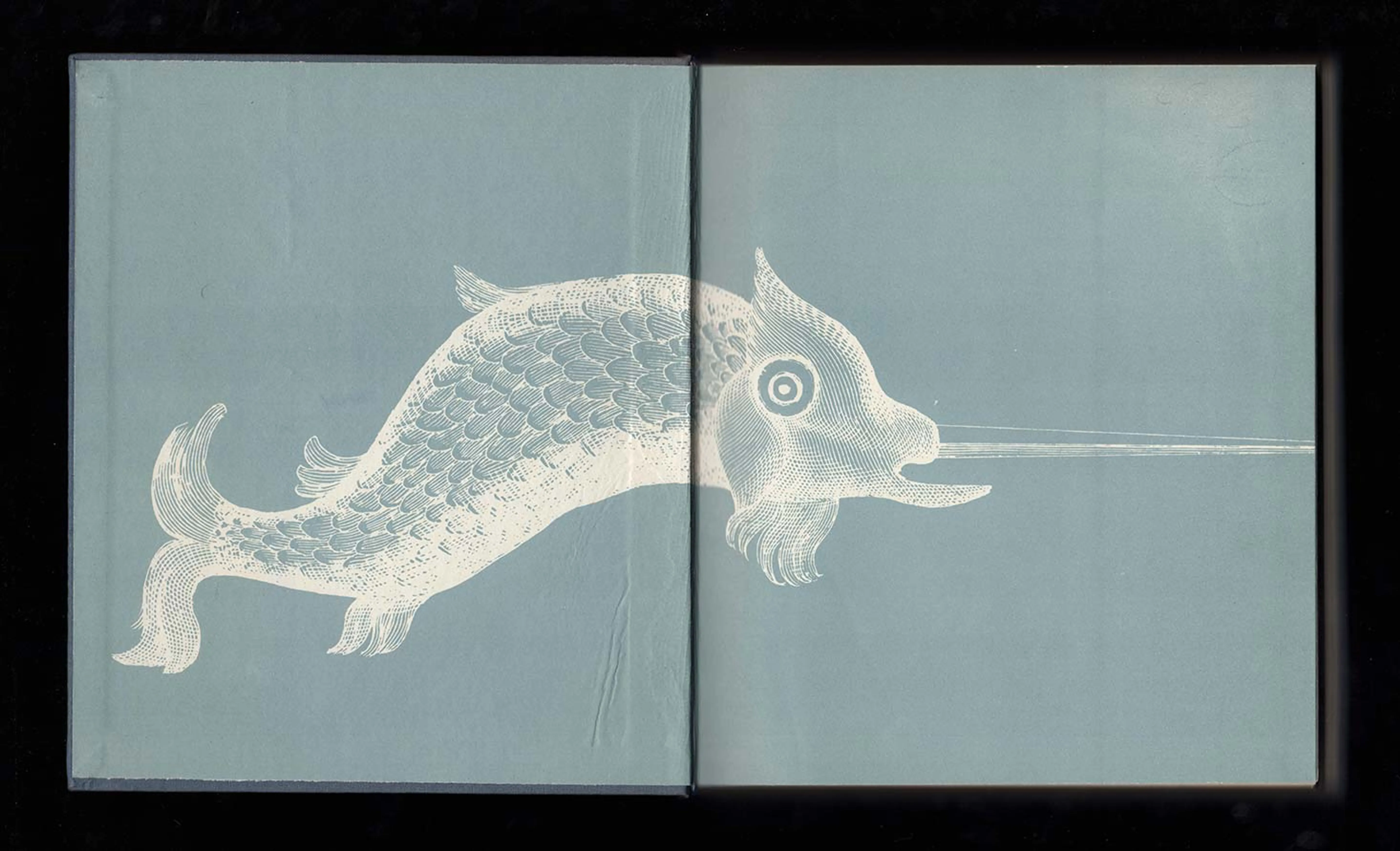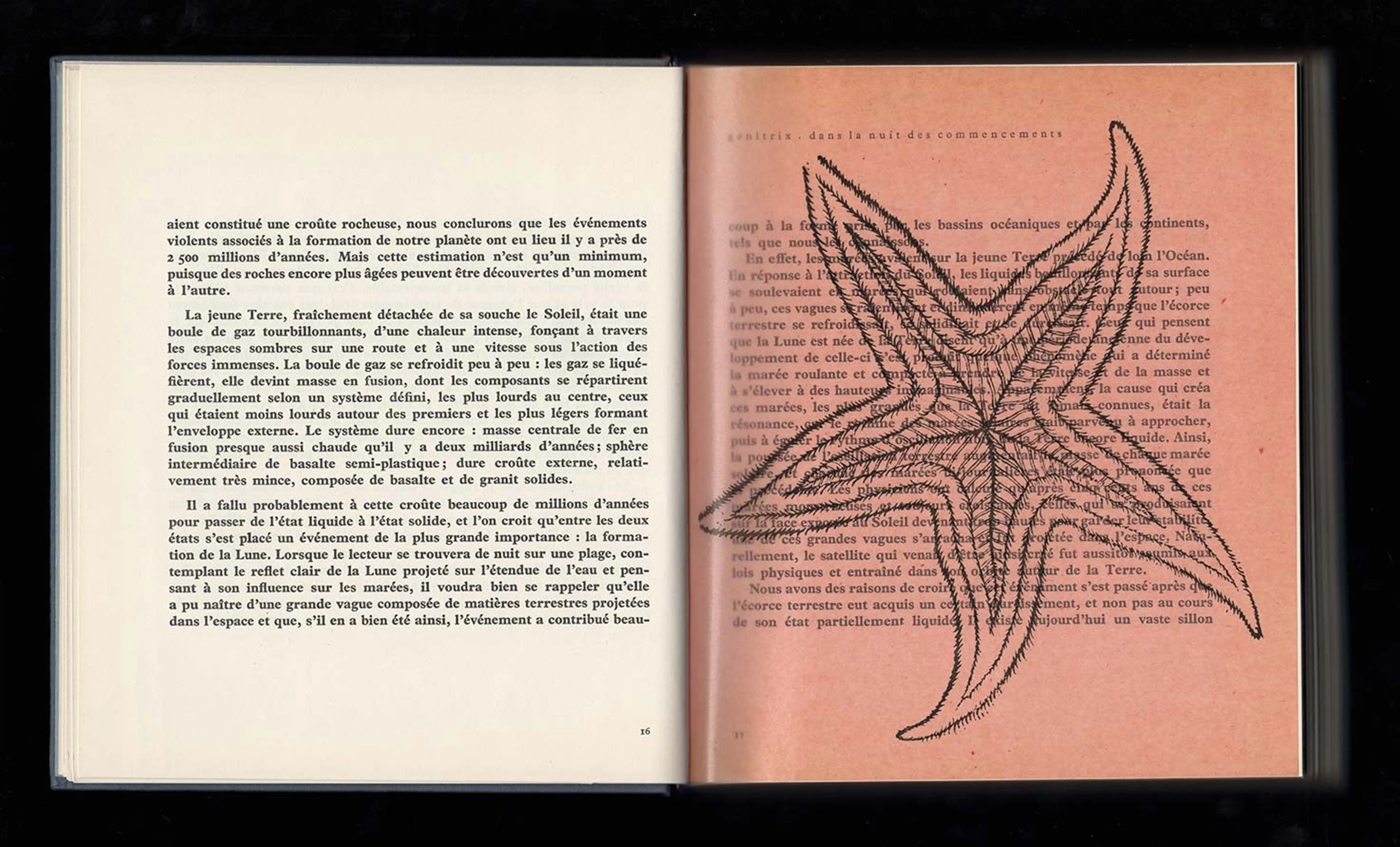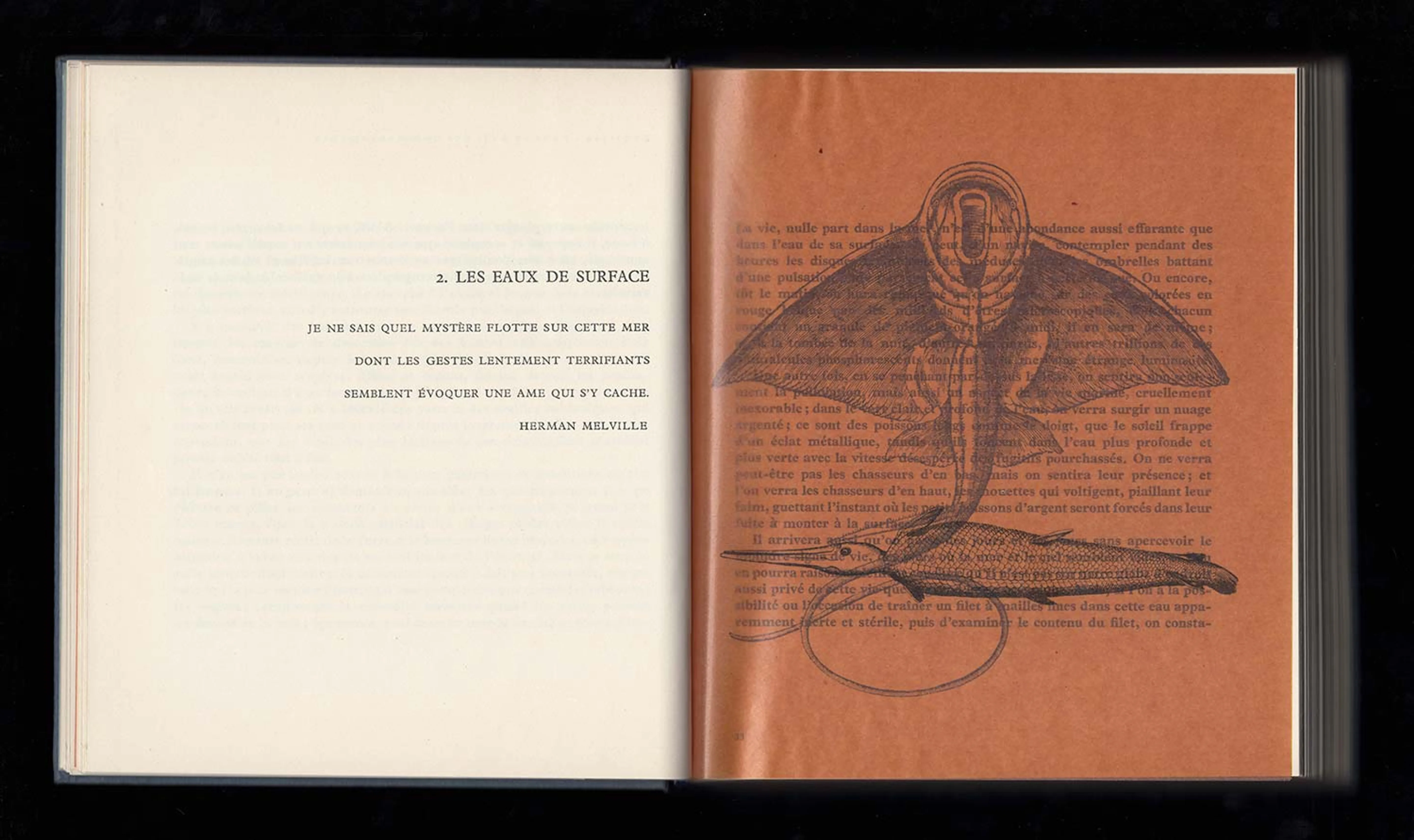 She went on to design over 100 books for the Club between 1954 and 1961. Among my favourites are Cette mer qui nous entoure by the American marine biologist and ecologist Rachel L. Carlson, published in the same year as La joie. With this book, Fricker gets to experiment with the physicality of the book, by the use of different materials, starting with a cloth-bound hardcover with illustrations of marine life creatures silkscreened in 4 different colours, with a dust jacket in transparent semi-hard plastic, with lines representing the movement of water silkscreened in black. This game of transparencies doesn’t end here. Inside the book, we find different illustrations of marine life printed in semitransparent coloured paper that interact with the text. At times, we can find two of these pages following each other, giving us several possibilities to interact with the same spread of text. Almost like being underwater and seeing different creatures pass us by.