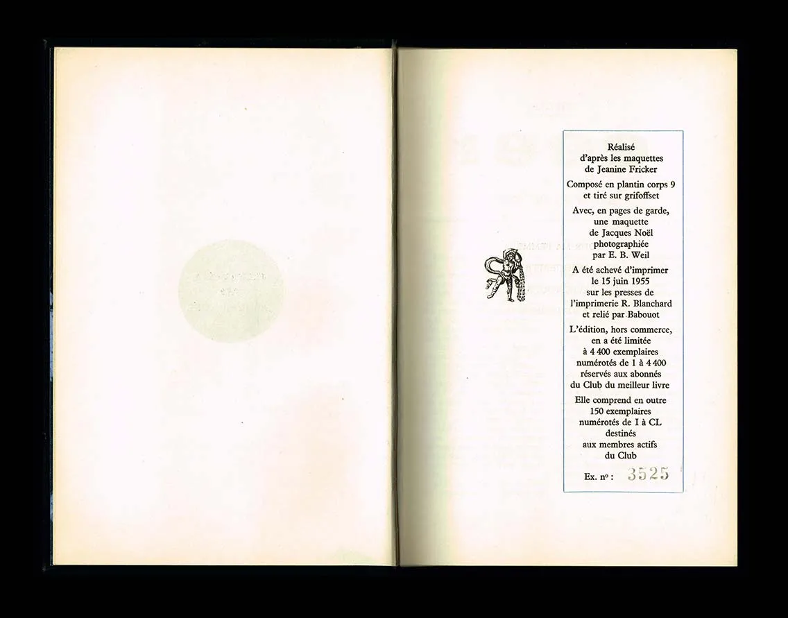 Due to Deberny & Peignot’s monetary problems, Fricker had to leave the studio and join the big French publishing house, Larousse, where she designed the catalogues of their book collection and their promotional material. While working at Larousse, she was contacted by the graphic designer Massin, who had seen her publicity work for Larousse in the newspapers. Massin was the art director of the book collection Club du meilleur livre, and wanted her to design books for the collection as a freelance designer. The Club was growing and they needed to add more designers to their roster.
