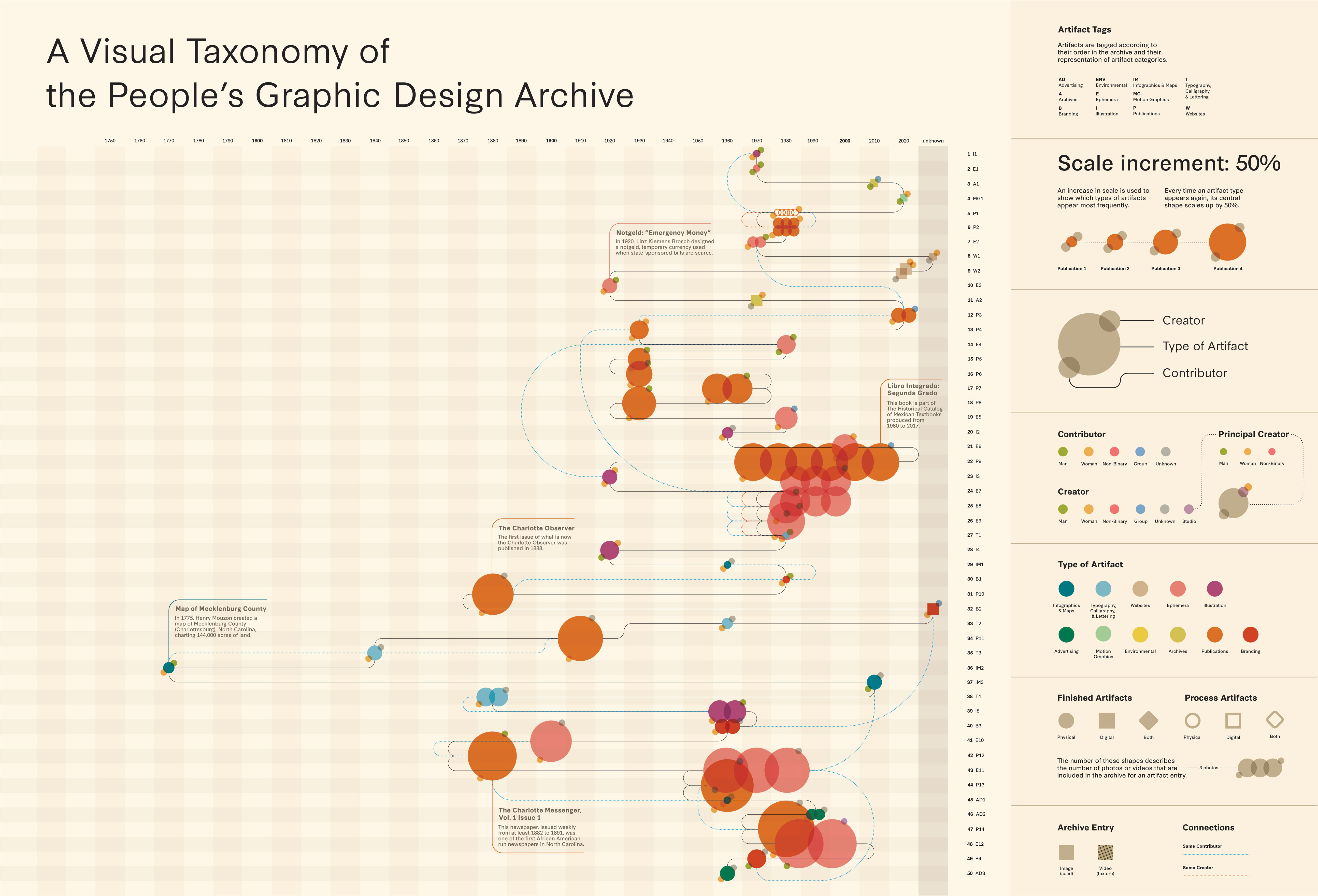My research looks at three digital design archives: the People’s Graphic Design Archive (crowdsourced), the Letterform Archive (curated), and the AIGA Design Archives (juried). I designed a visual system to help spot general trends within these three archives. You can find my whole thesis here, in which I also look at ways that history has been visualized in the past. For the sake of this post, I’ll be focusing on my findings with the People’s Graphic Design Archive (PGDA).