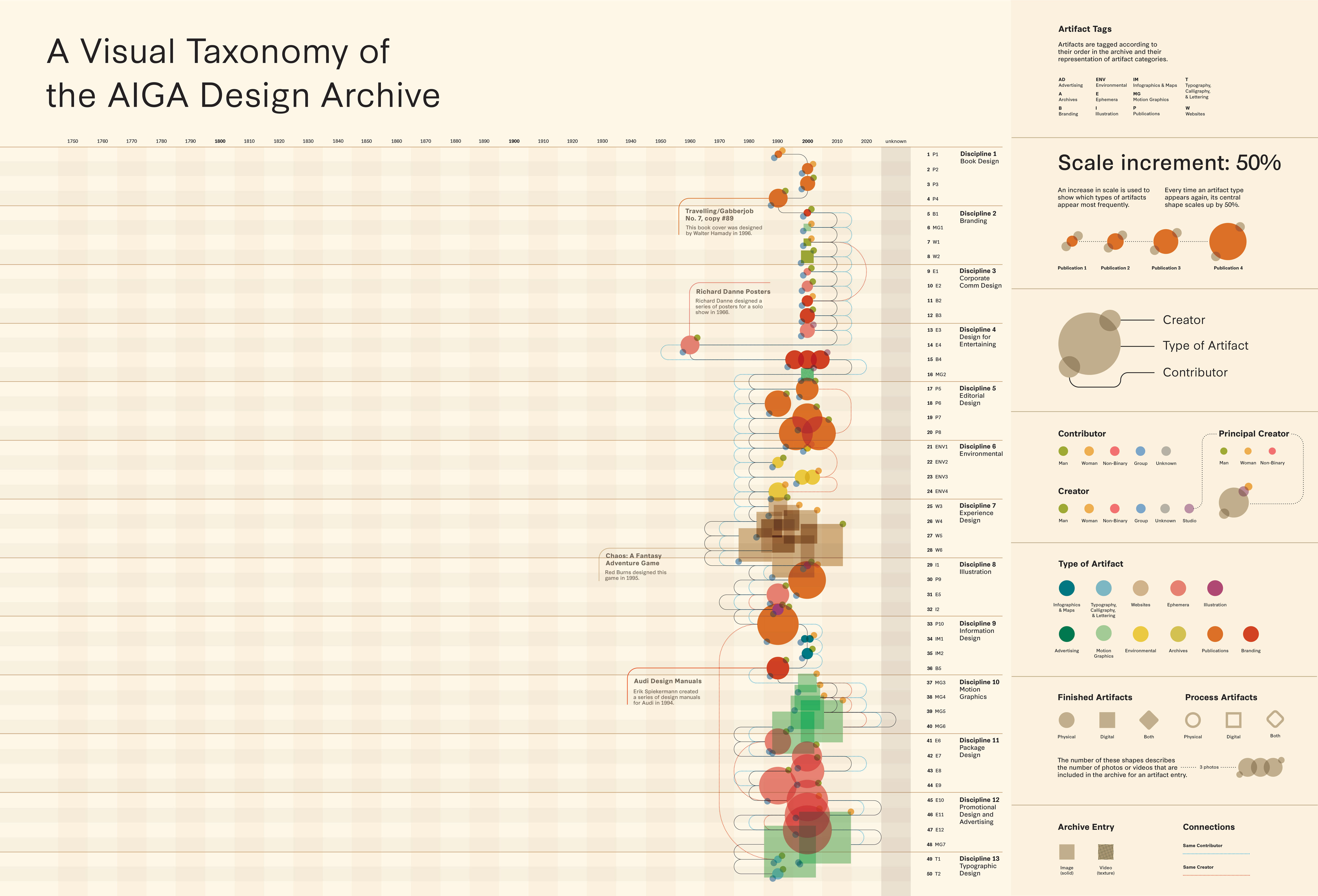 The horizontal spread of artifacts is also notable—referencing the timeline at the top of the chart, we see that most artifacts are from 1960 onward with an outlier from 1770. In general though, these artifacts have a fairly even spread across decades, with perhaps a focus on the 1970s onward. Of course, we can’t confidently make generalizations for the entire archive based on this sampling of 50 artifacts. However, we can get a sense of the archive’s construction, especially when we see other archives represented with the same system alongside the PGDA chart. Below are charts for the Letterform Archive and the AIGA Design Archives.