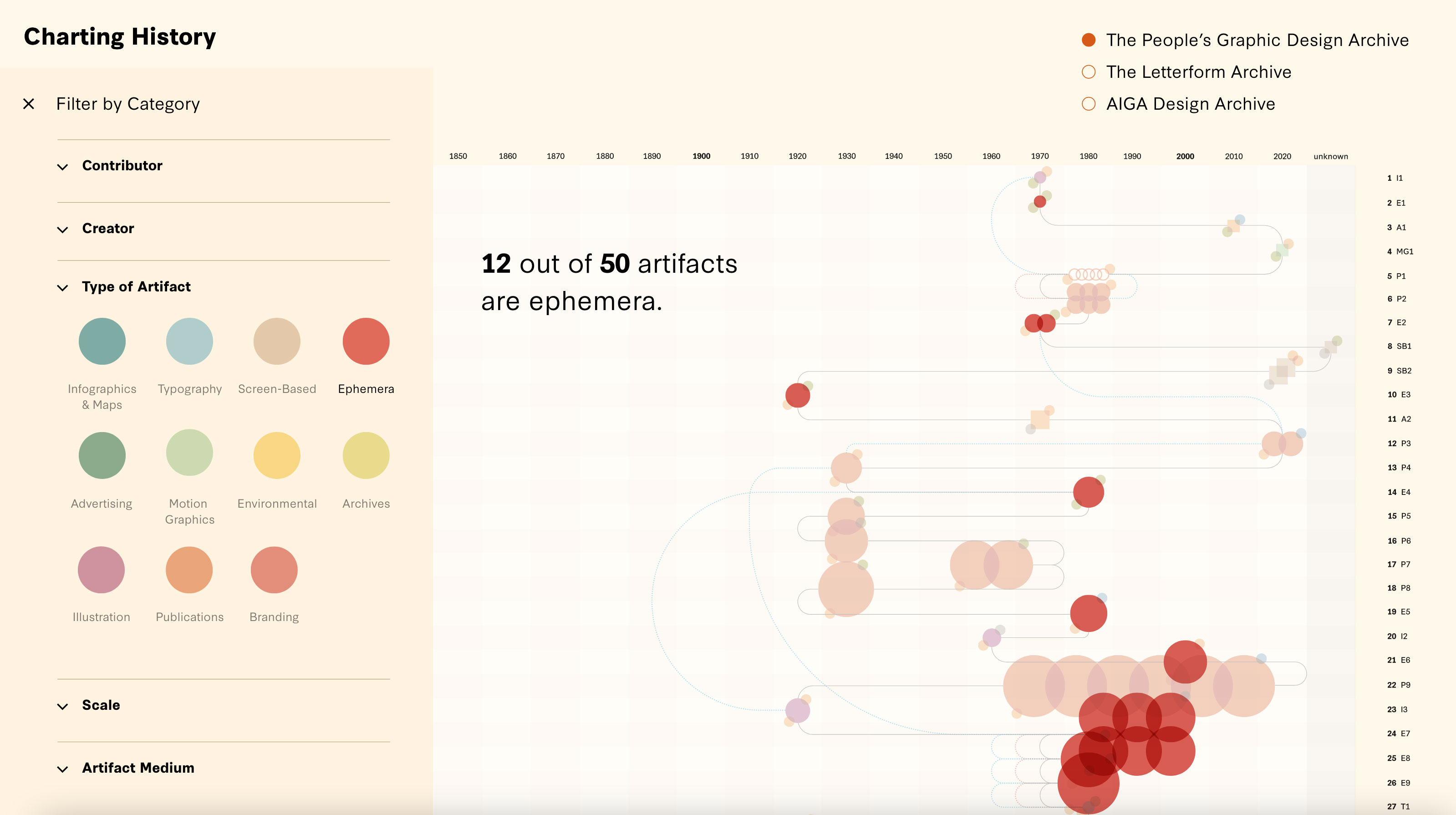 This interactive prototype allows viewers to filter archive visualizations by artifact type, creator, contributor, and more.